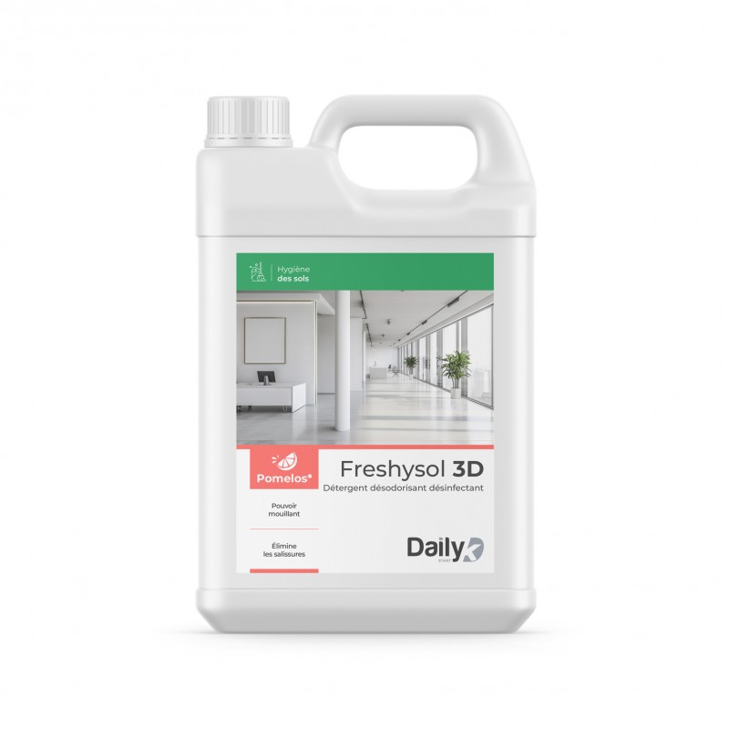 Freshysol 3D est un détergent pour tous types de sols et surfaces lavables. Il a une triple action, c’est un détergent, dégraissant, désodorisant avec agent bactéricide.